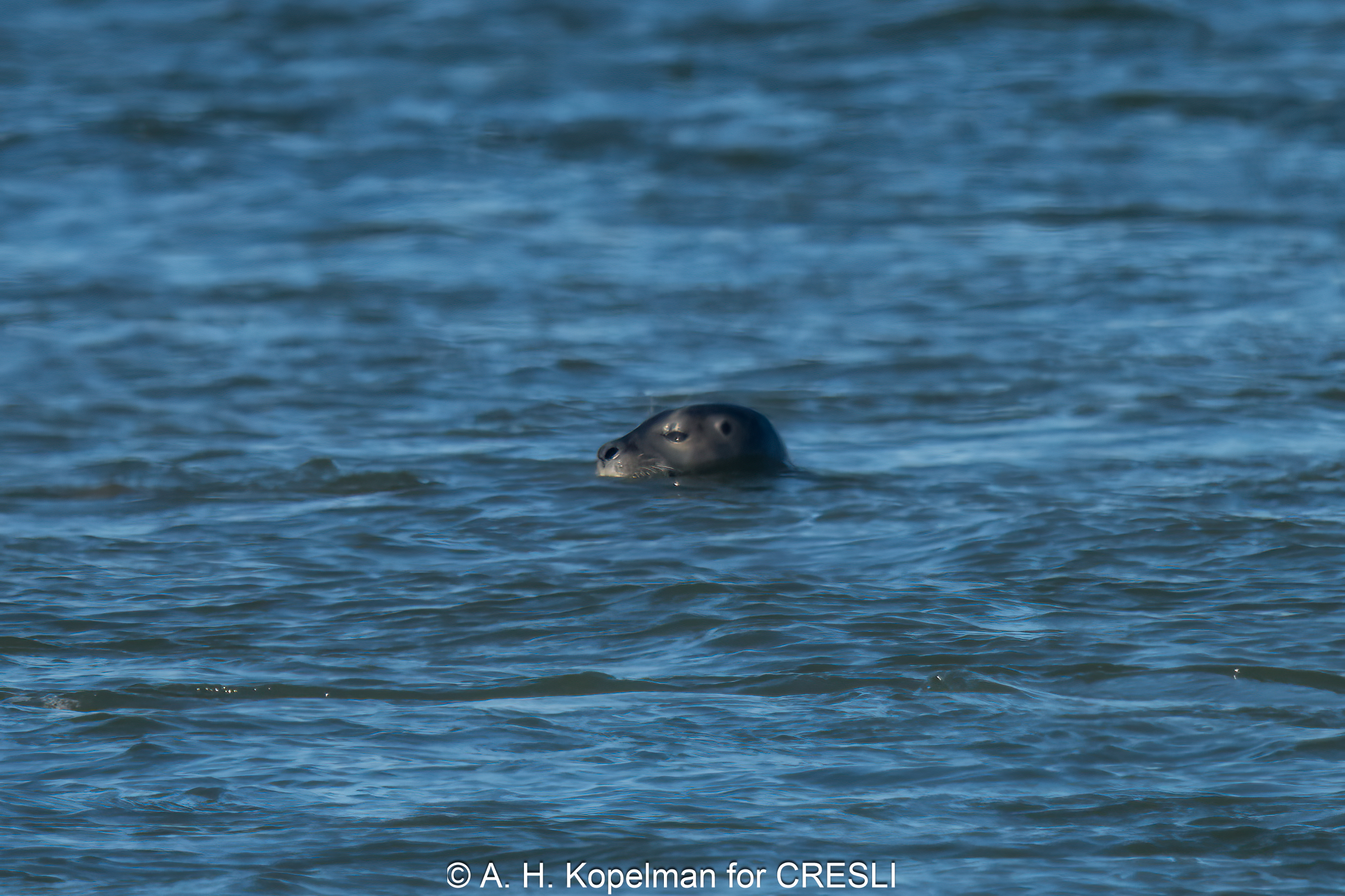 On this day, prior to the group's arrival, CRESLI co-founder, president, and senior scientist, Dr. Artie Kopelman, walked to an area to see and photograph the hauled-out seals from afar. About 25 harbor seals were photographed using a Nikon Z8 with a NikkorZ 18-600 mm lens with a 2x multiplier, giving e an ffective 1200mm lens view. From approximately 450 yards away, 20-25 Atlantic harbor seals could be seen. About 80 minutes later, as we approached the path, in the distance we saw a small vessel moving slowly and directly at the seals. They flushed. Eventually we made our way towards the water and were able to see and photograph a handful of Atlantic harbor seals.